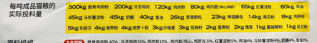 啥麦肯鸡,一共就百分之十几的冻鸡肉,排第一的是肉粉,肉粉一共50%。这个猫粮最近都在推,唉,还有一个啥粮也是。