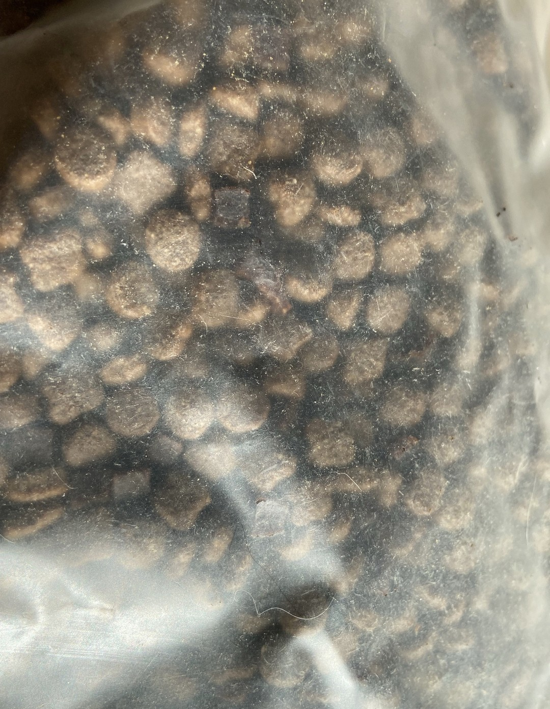 味道闻起来很香,不是鱼腥味,不是奶味,是肉味。狗子爱吃也不挑食!都是小颗粒,狗子吃了之后不会咳嗽,(如果吃粮太快容易咳嗽呛到,建议买个慢食盆儿)!