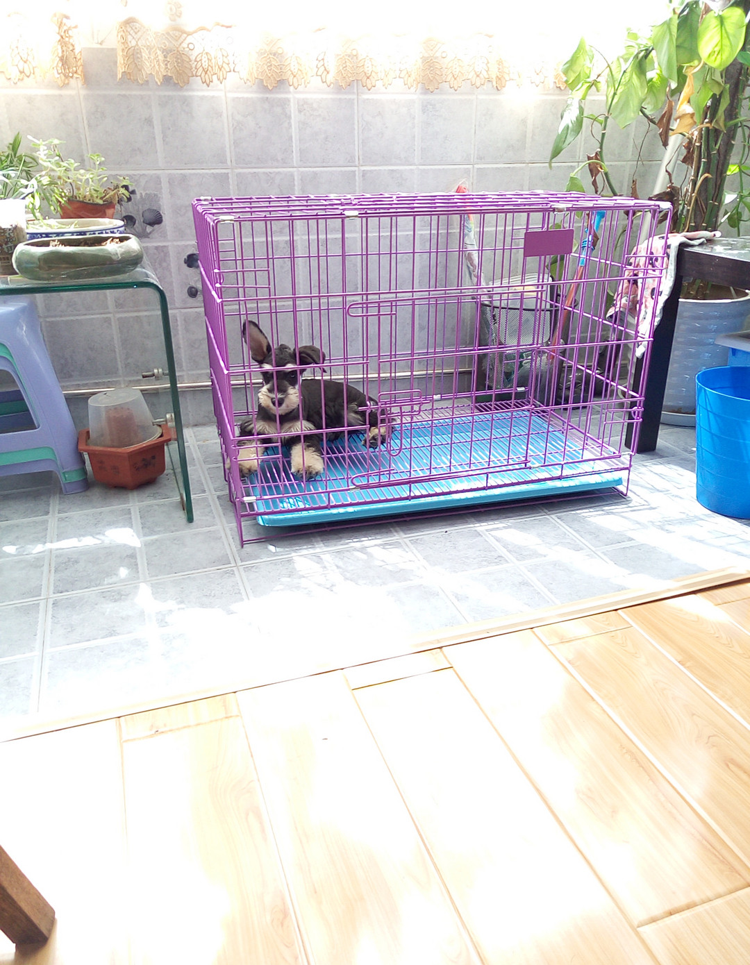 从宠物店买的折叠笼子,带托盘,可以在家小便。
