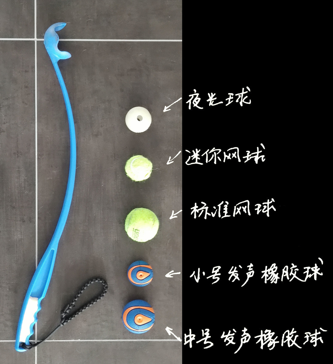 与之配套的抛球杆分大号小号,我选择了大号,长66cm,可以抛射直径6.5cm的同品牌橡胶球或者标准网球。成年男子抛射橡胶球可以轻松扔到30米开外,也不用直接用手去捡湿乎乎脏兮兮的球了,室外投球必备。需要注意的是,大号抛球杆的“工”字形状握柄简直反人类,非常咯手。我在凹槽内填充了“水晶土”,手感要稍微好一点,但手指处的凹凸非常大,仍然很硌手。我还用伞绳编了个手绳,便于携带,也可以避免整个杆子甩出去。