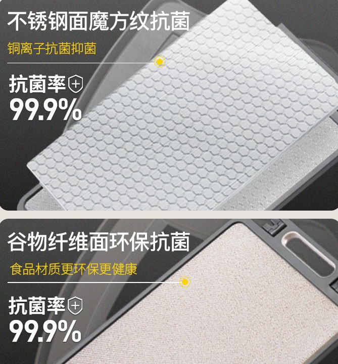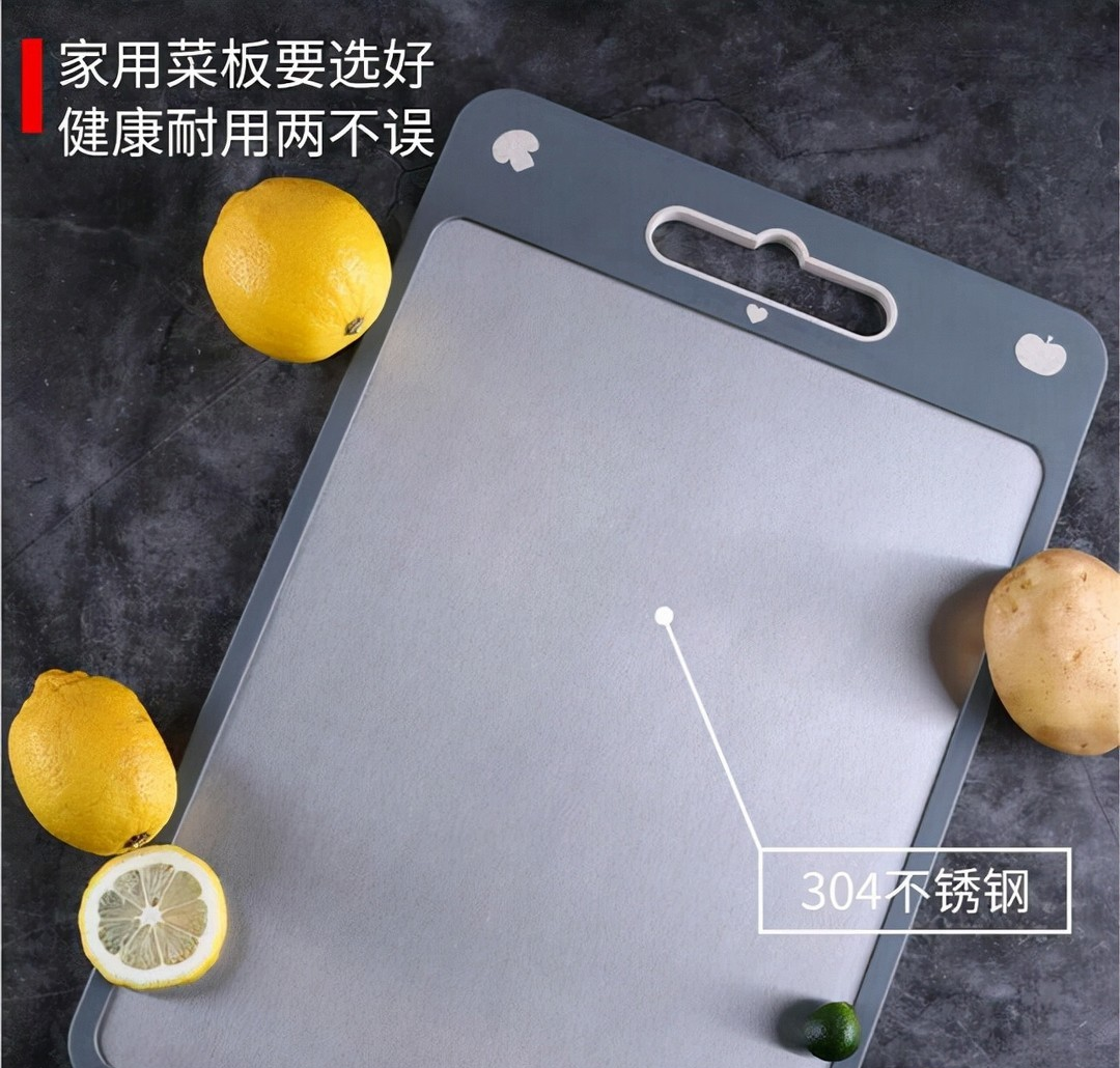 不锈钢菜板面,可以用来切肉、海鲜、水果等等,利用铜离子杀菌,还能适当地去腥除味。
