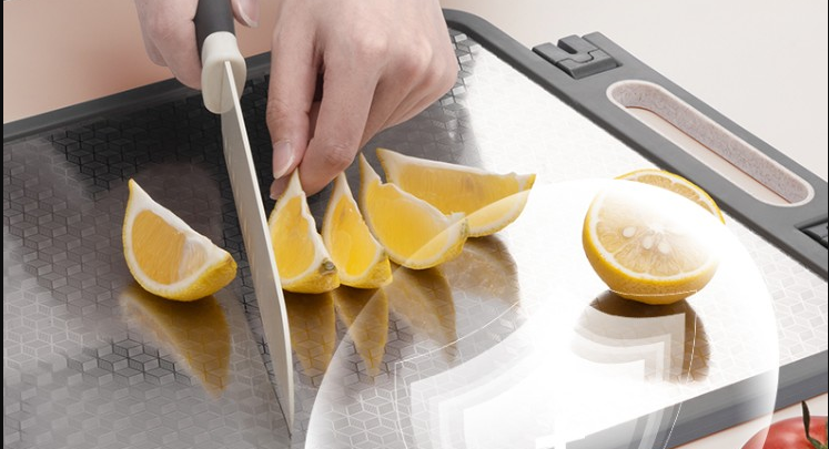 菜板周围由TPR橡胶圈包裹,因此能够有效防滑减震,就算大半夜剁肉,也不会产生噪音,影响到邻居。