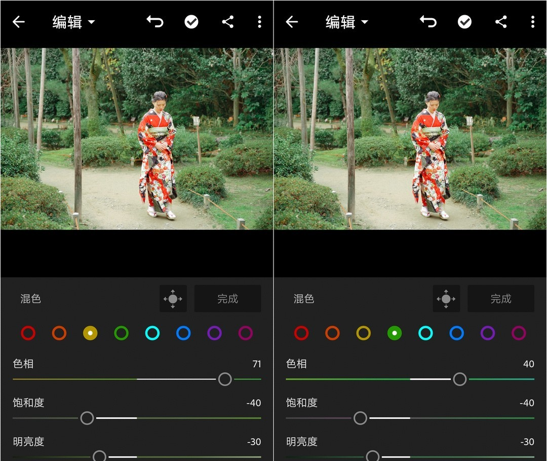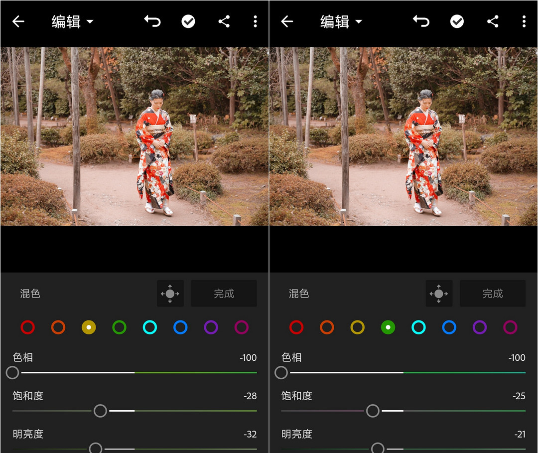 在本例中,我让黄色的色相偏绿,并让绿色也更绿,同时调低了黄色和绿色的饱和度和明亮度。整个画面颜色显得统一、干净了。