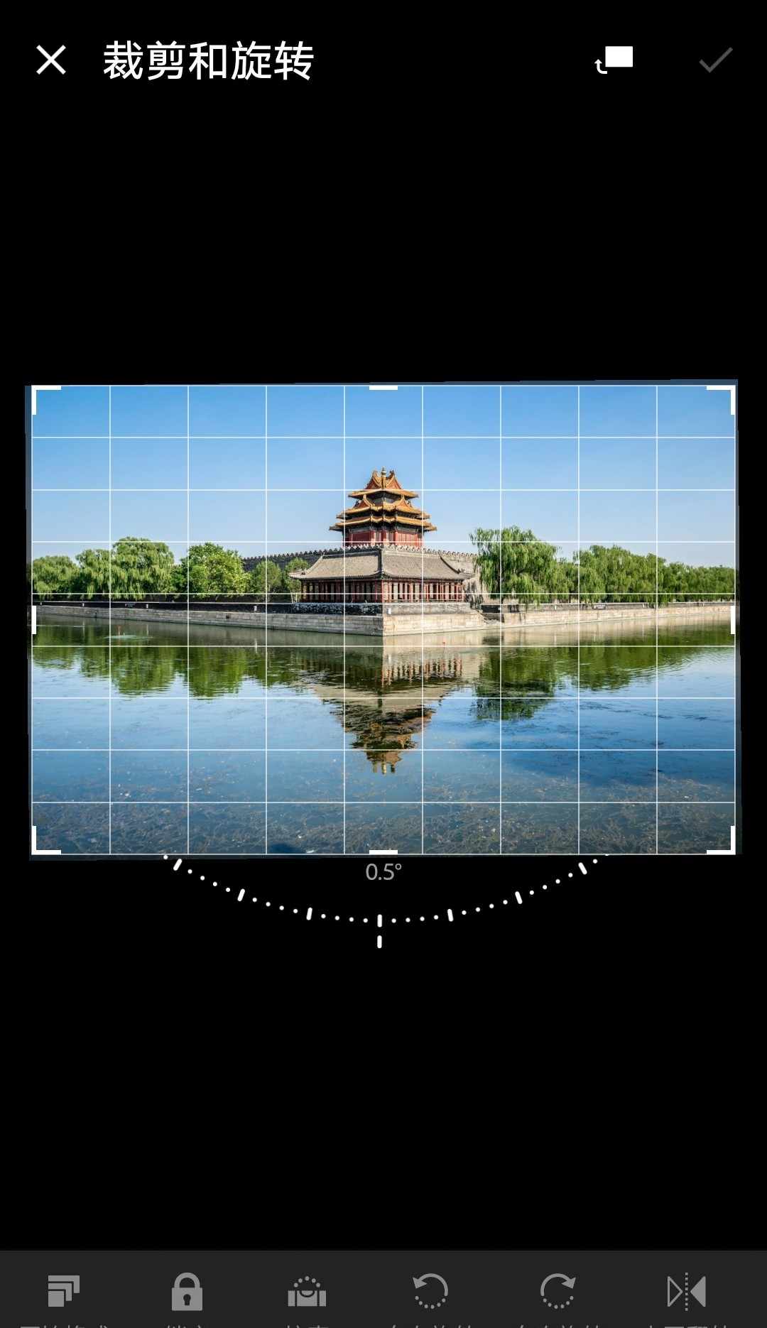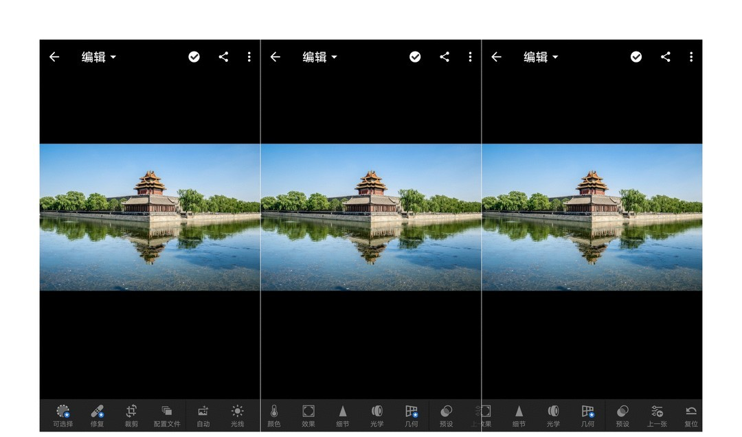 拉直的方法有两种:1. 手指在照片下面半圆的图形那里滑动;2. 点击页面底端的“拉直”模块,LR会尝试自动找平。