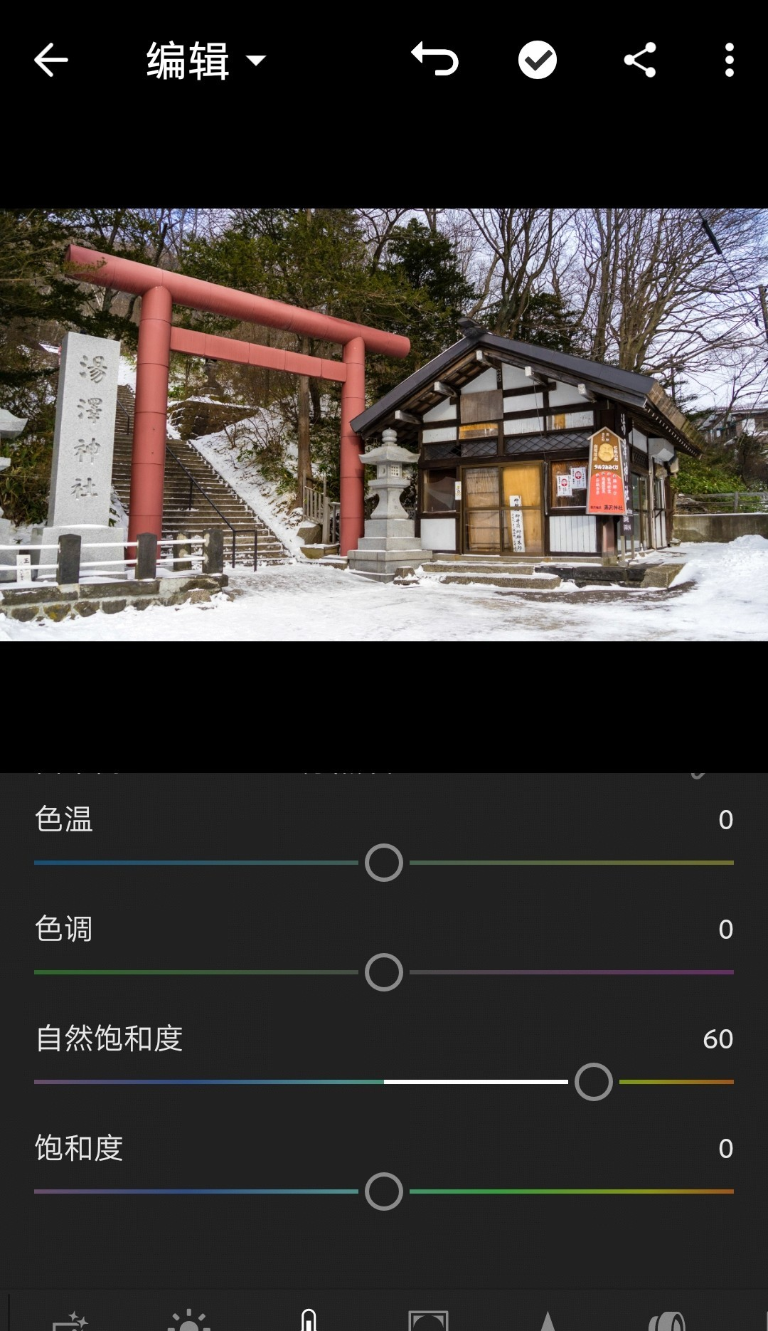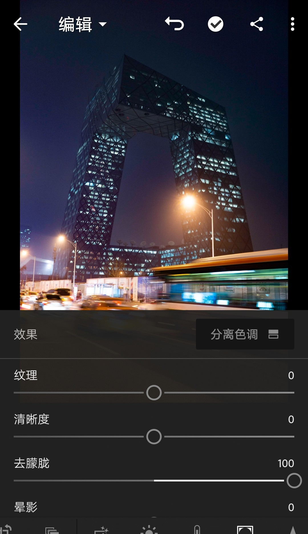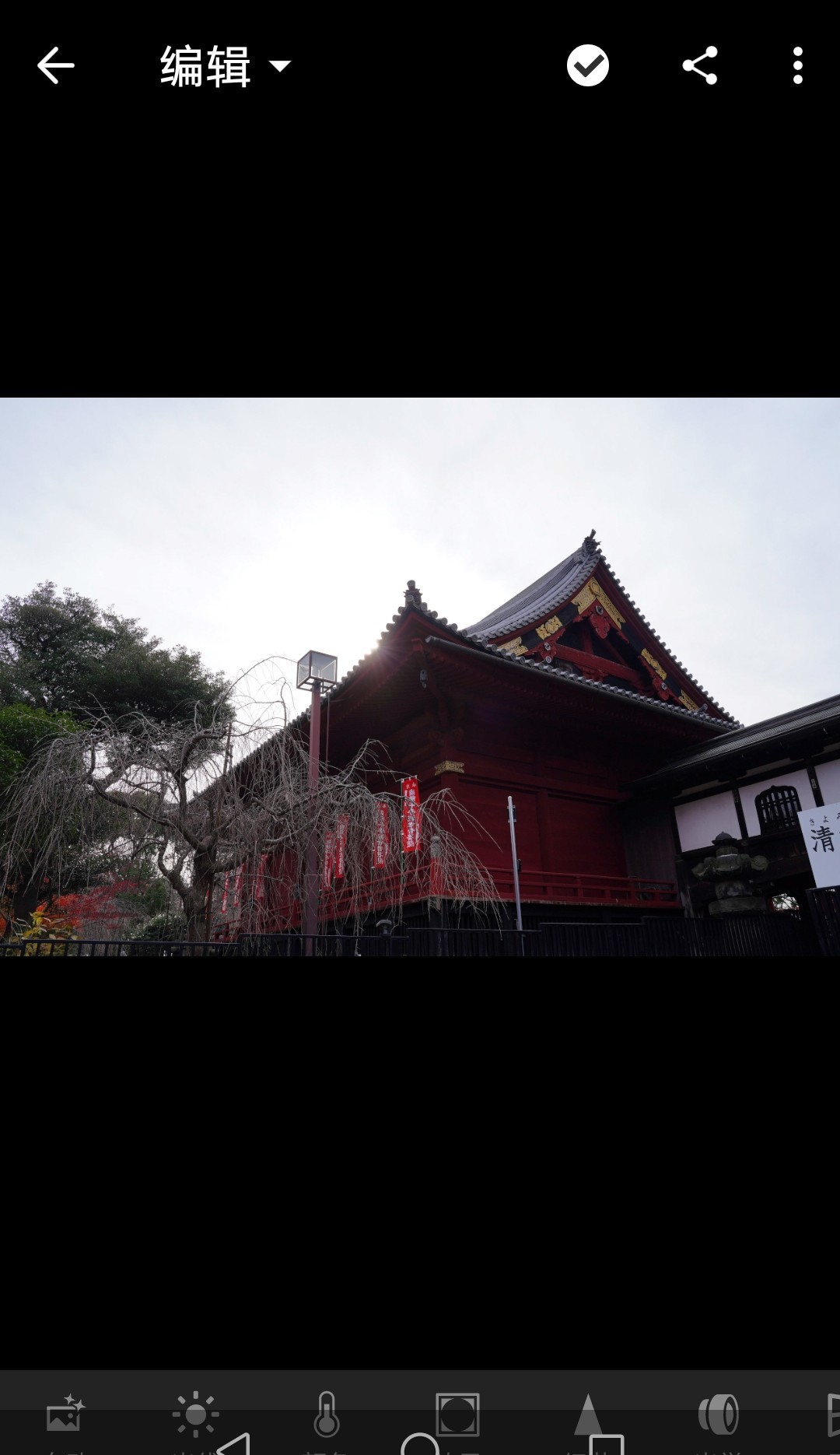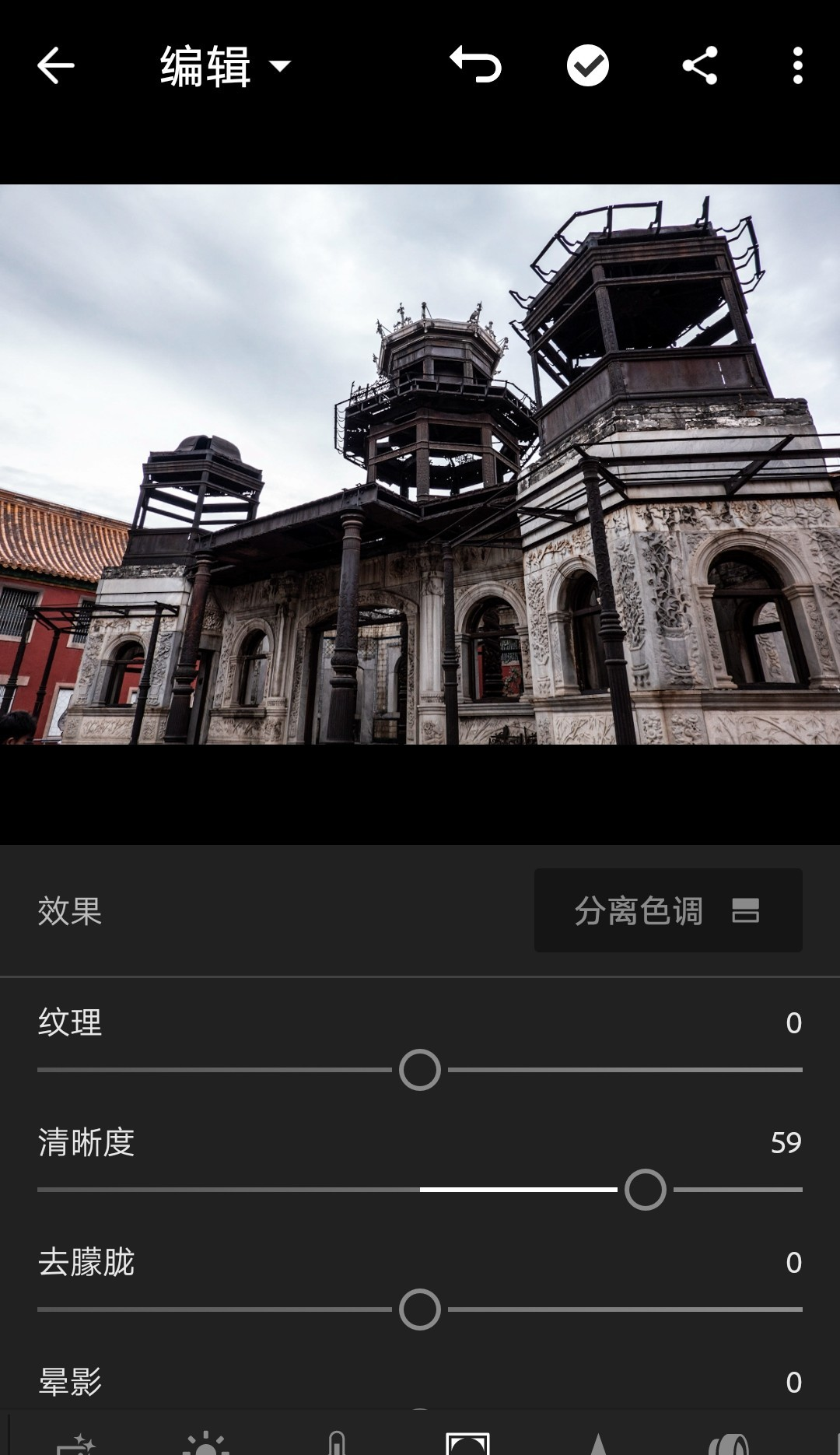 例图是在故宫的延禧宫拍的。我把清晰度增加到59。为什么不加到60呢?因为左右滑动实在调不到整数了……差不多就行。记感觉,别记数值。