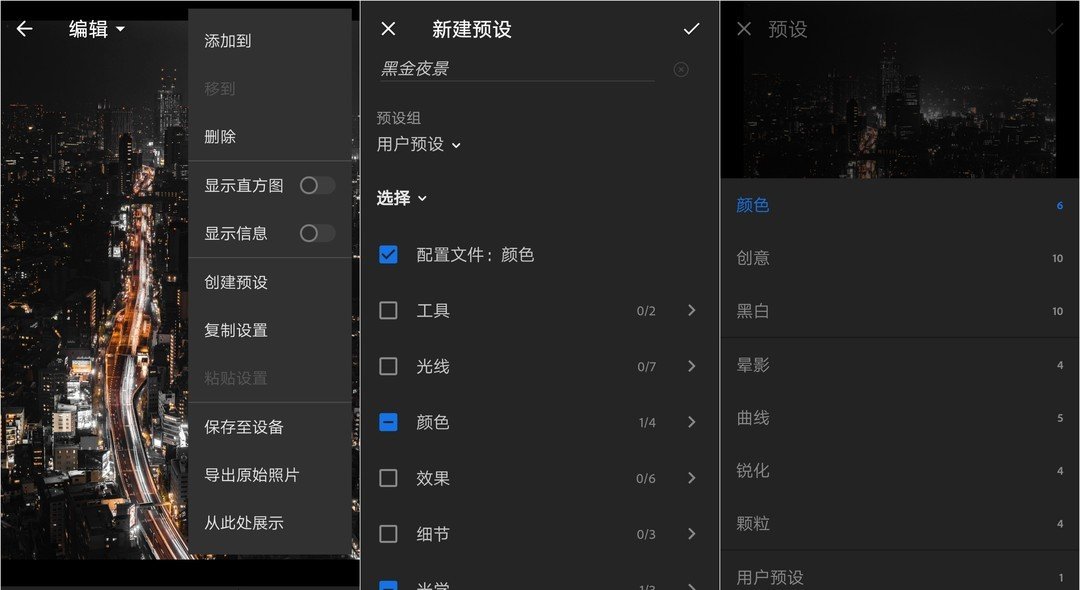 点击主编辑界面右上角的三个点,选择创建预设。在新建预设界面,可以给预设起个响亮的名字。同时选择预设包括哪些调整。新手可以从全部勾选开始。回到主界面,点击“预设”模块,下拉到用户预设,即可找到你刚刚保存的预设。