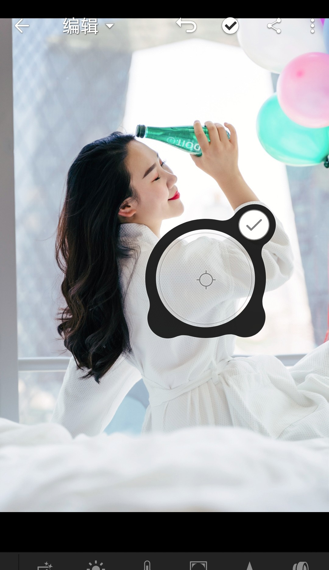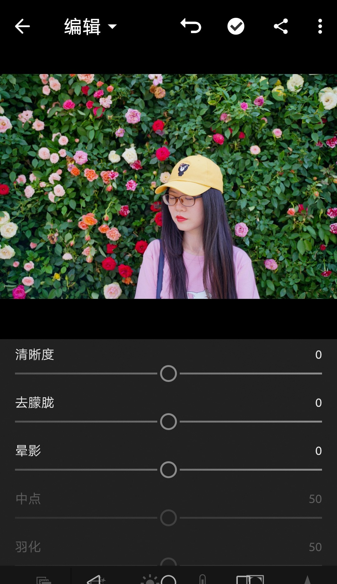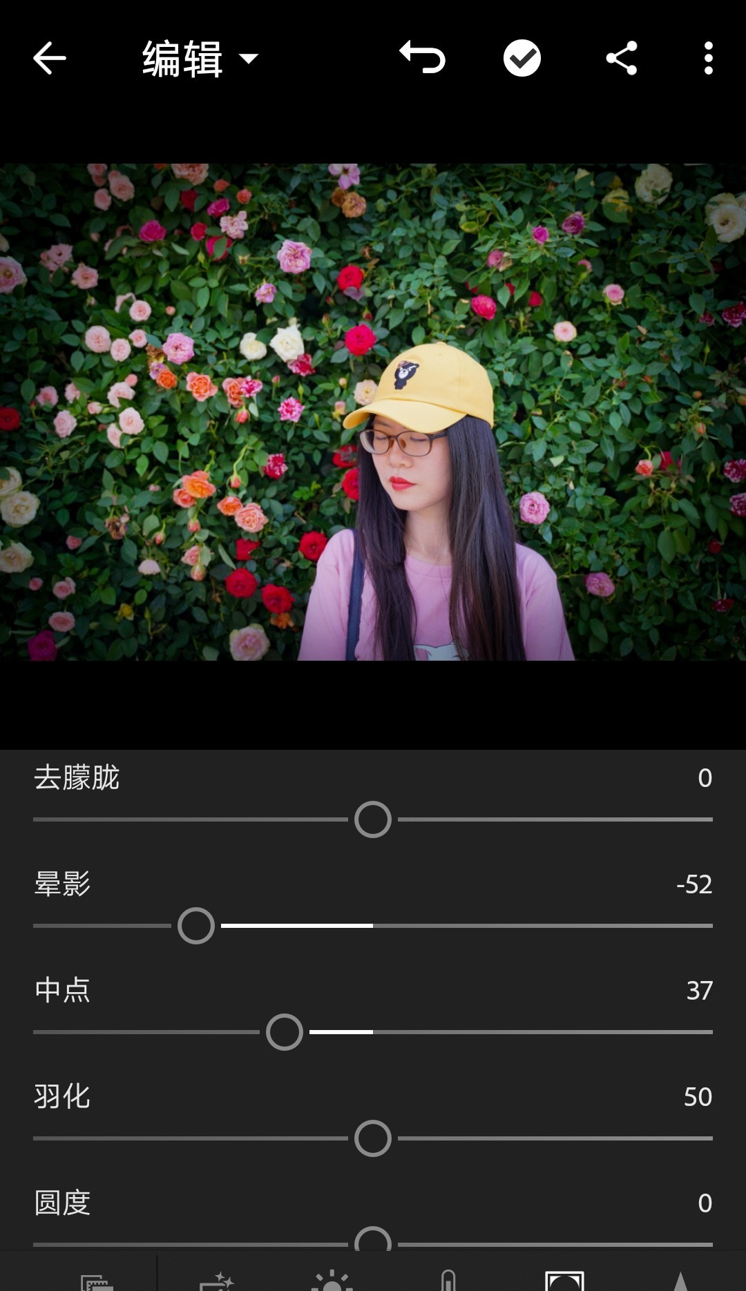向左滑动是增加黑色晕影,向右滑动则是减少黑色。这里我把晕影减到-52。调整中点可以调整晕影的范围,调整羽化可以调整晕影边缘的清晰程度,调整圆度可以调整晕影的圆度。