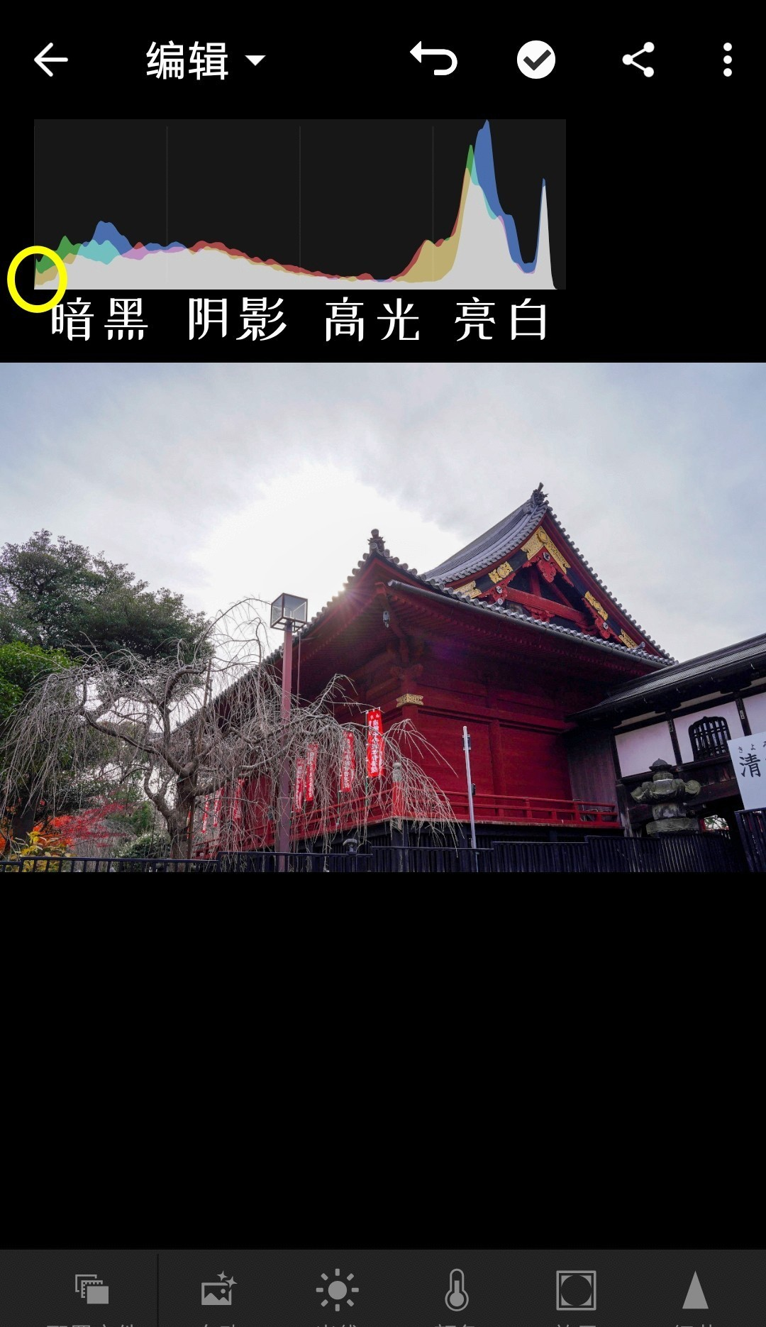 可以看到直方图被分成了四块,大致对应的就是“亮白”“高光”“阴影”“暗黑”了。实际上,这四个区域各有重叠,也不是正好四等分。手机版LR做了简化。