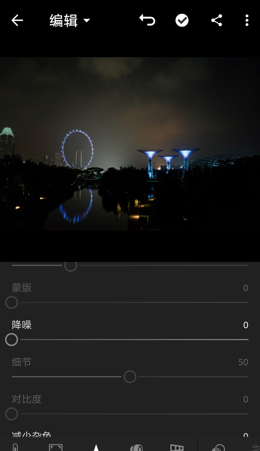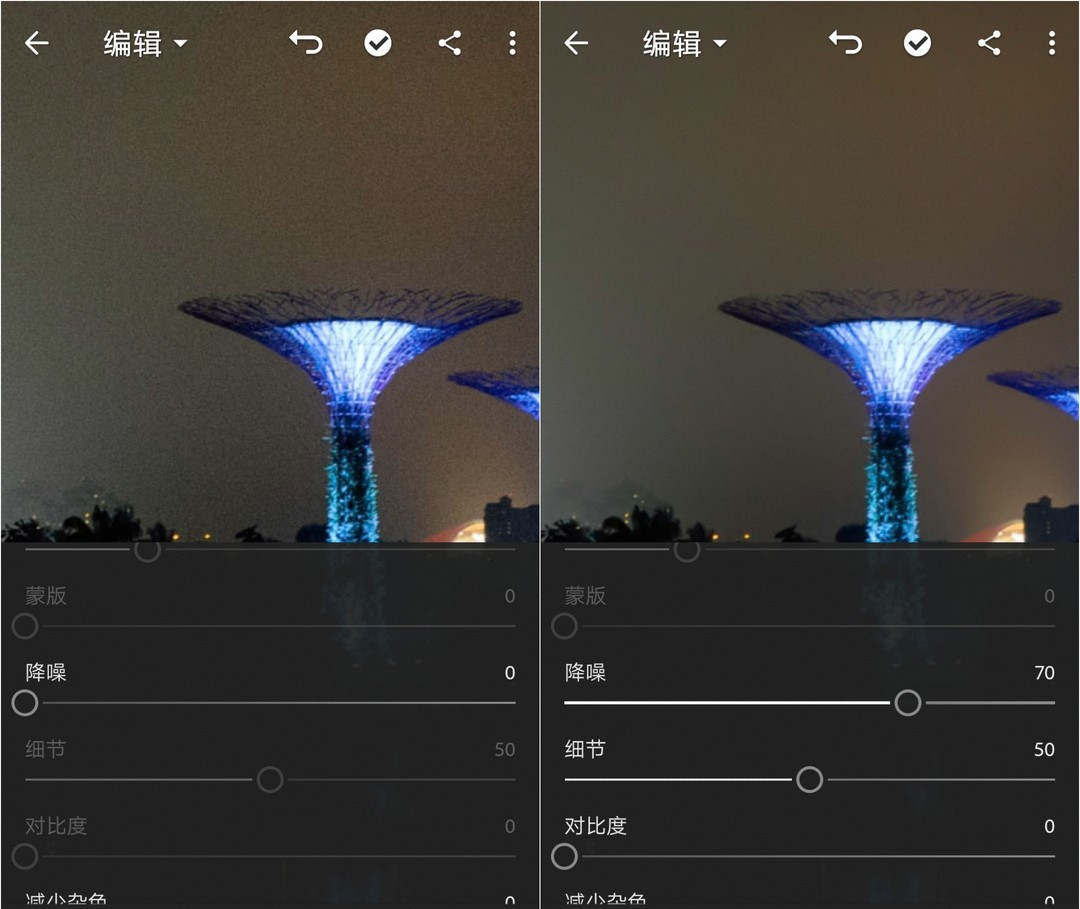 放大图片以便观察效果。将降噪滑块向右滑动,直到满意。降噪加的越多,涂抹感就越重、细节损失也越多,所以不是越高越好。关键是你满意了就好。