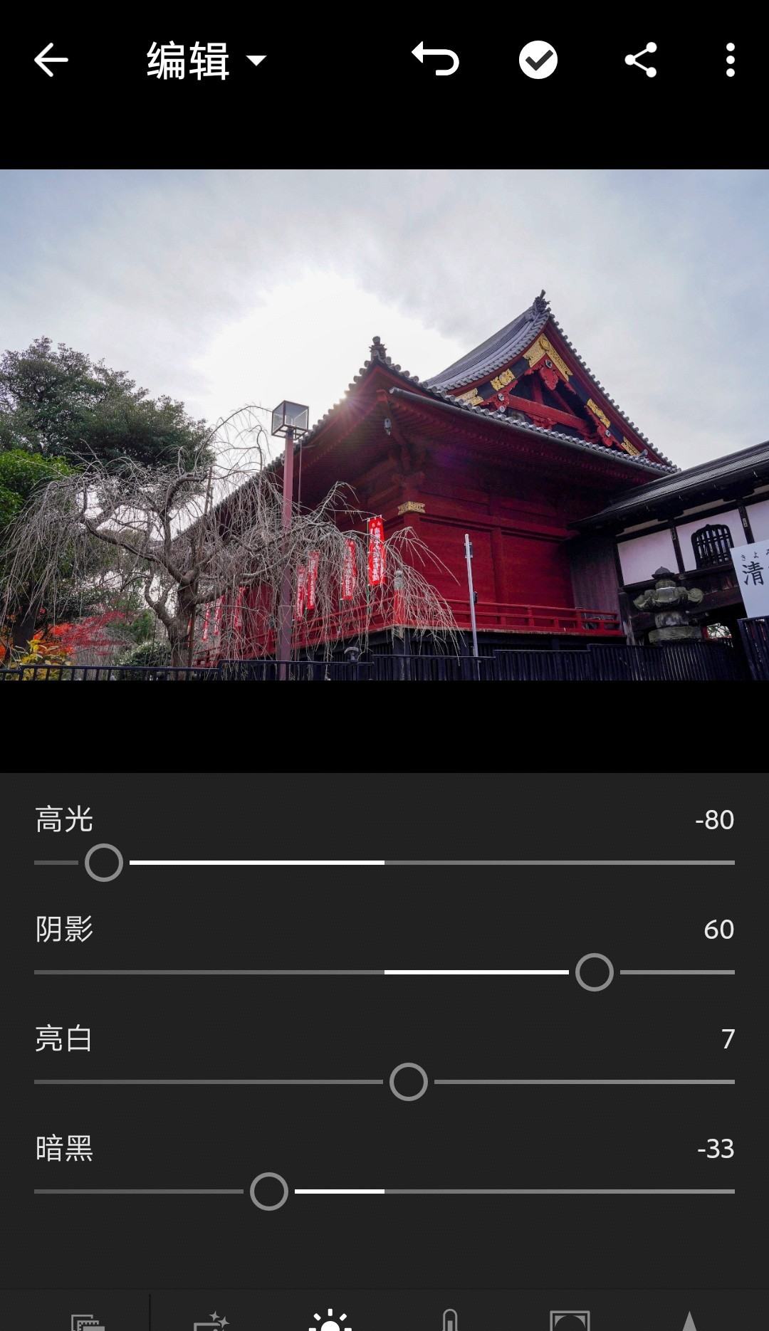 本例中,将高光调到-80,让天空中的云朵出现;阴影调到60,让建筑物的暗部细节显现。同时,稍微把亮白加到7,让最亮的部分还原,把暗黑调到-33,最暗的部分也还原一些,这样画面不会灰蒙蒙一片。
