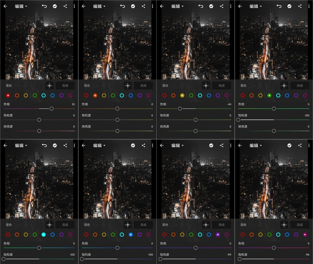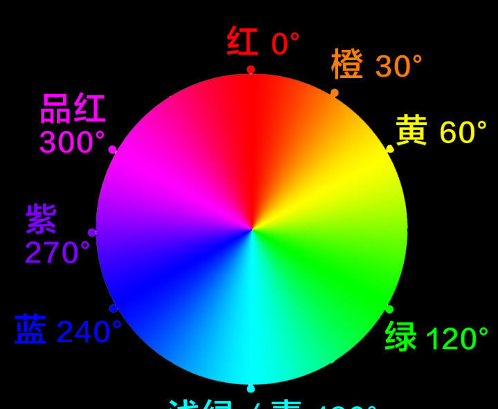 HSL调整中涉及的八个颜色。每个颜色的色调都可以向它附近的两个颜色偏。