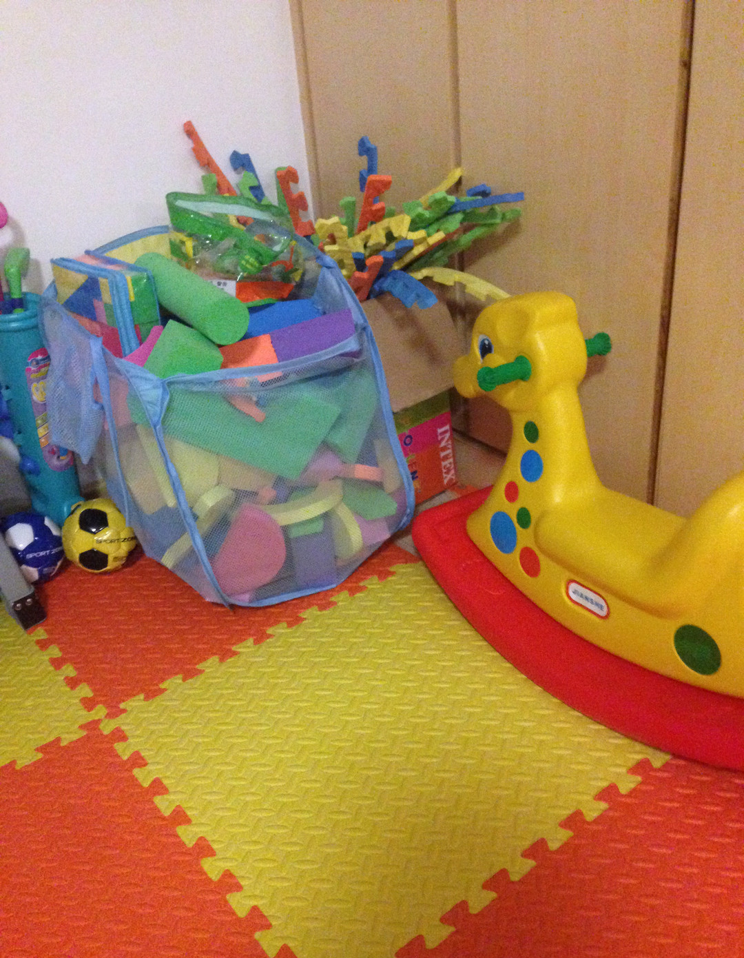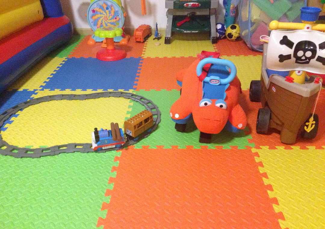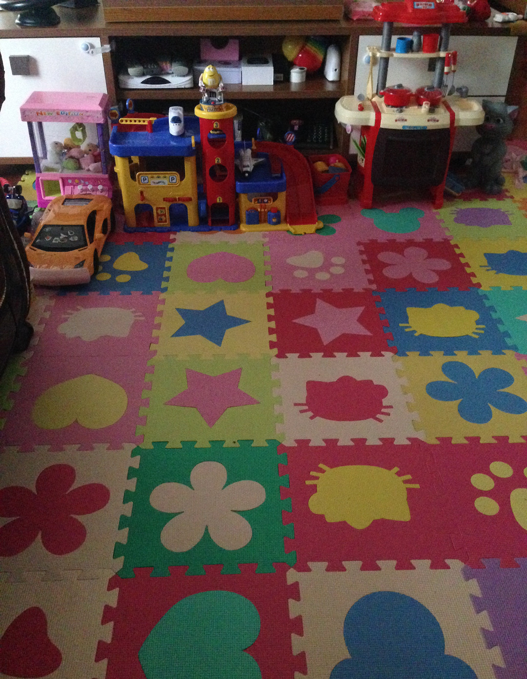 游戏区安排在了卧室里,电视前方,一圈沙发中间,茶几搬走了铺上一层垫子,配以若干玩具即为完成。主打方便,宝宝午睡起床,想玩过来就玩。我还可以躺沙发上看会电视