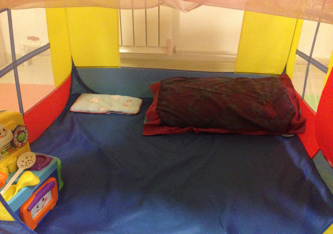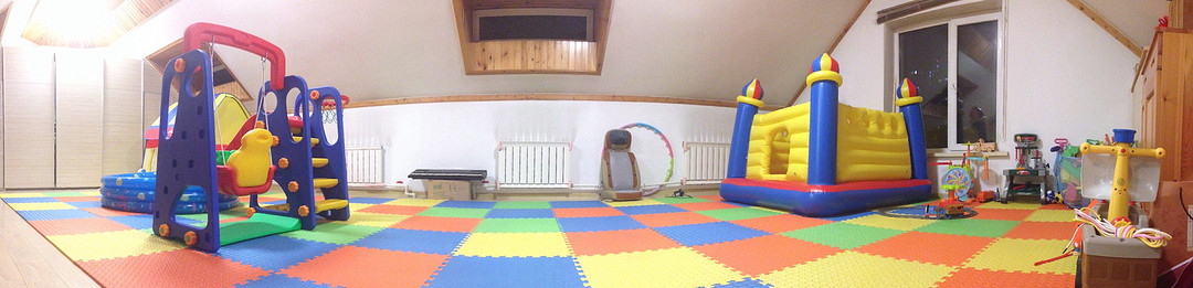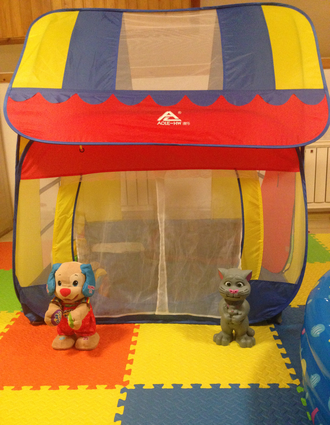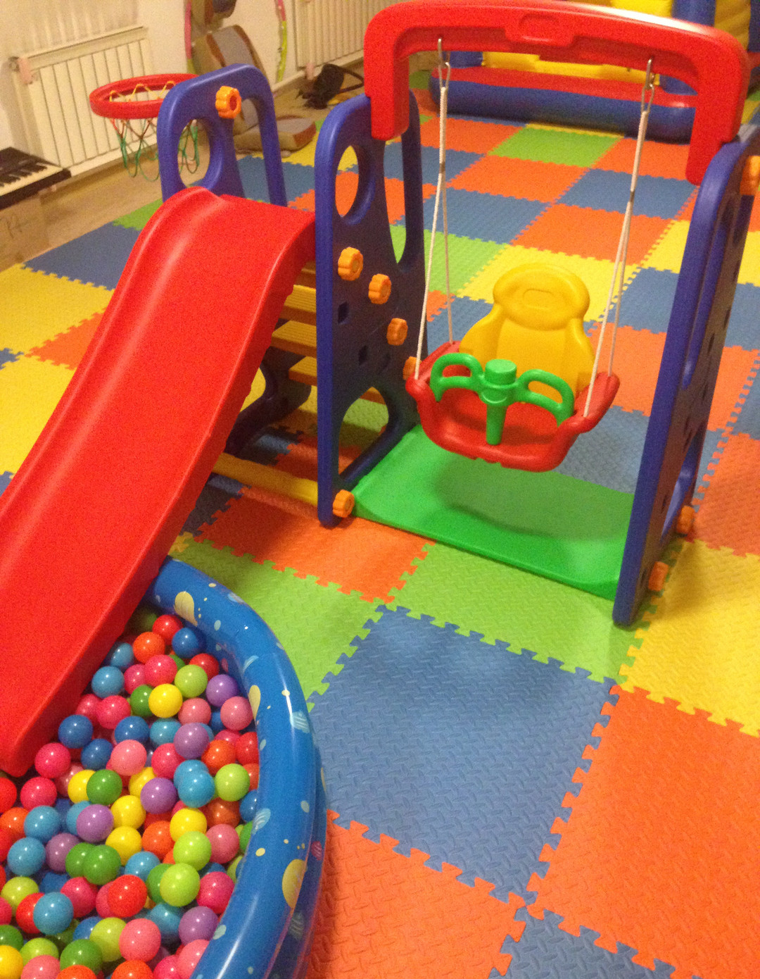 游戏区安排在了卧室里,电视前方,一圈沙发中间,茶几搬走了铺上一层垫子,配以若干玩具即为完成。主打方便,宝宝午睡起床,想玩过来就玩。我还可以躺沙发上看会电视