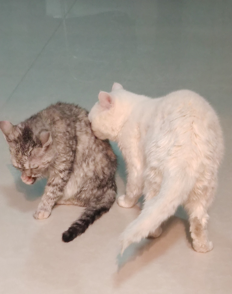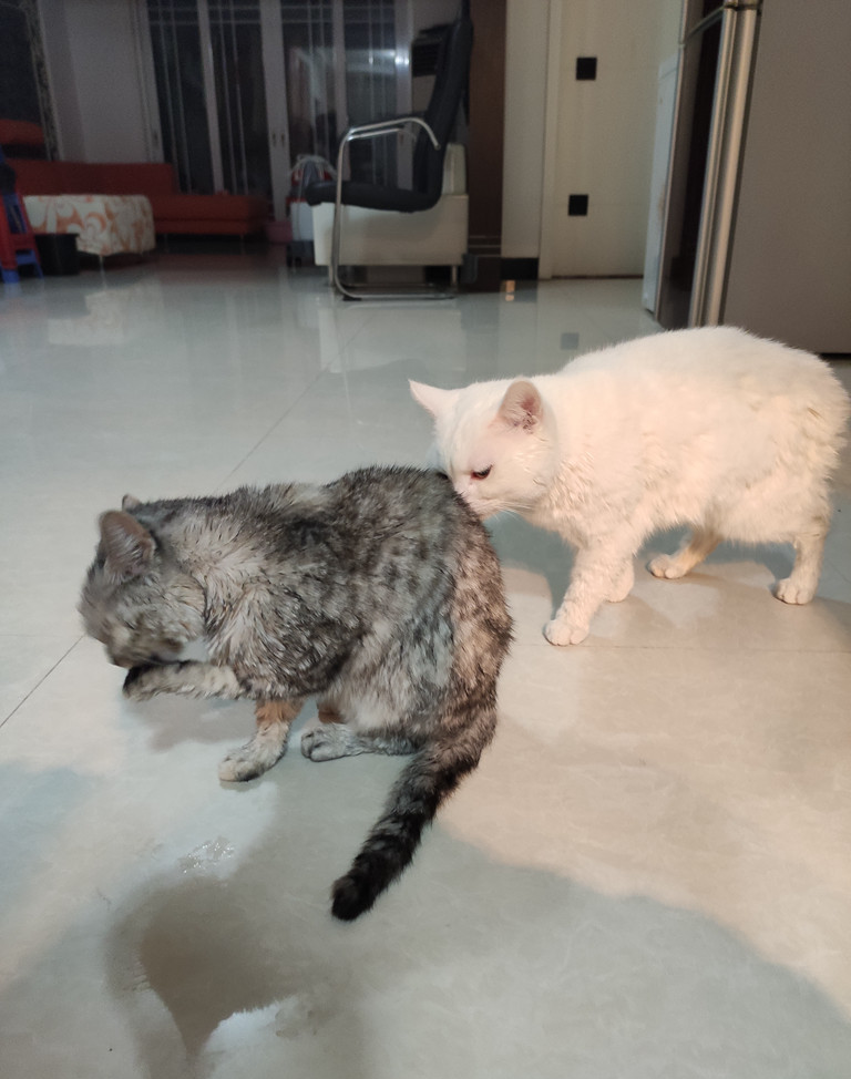 因为身上气味变了,俩猫一边自己洗澡,一边互吸了很久,反复确定了面前这位还是不是以前那货。