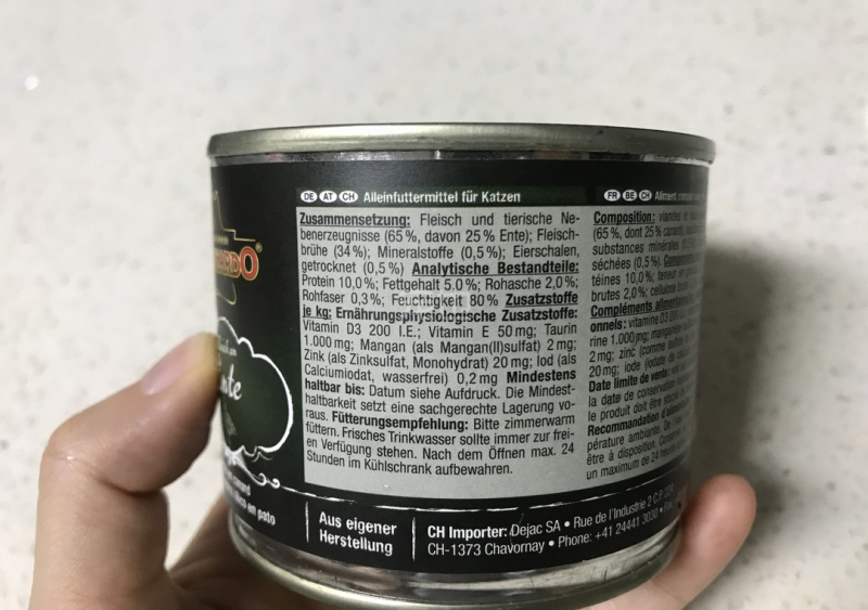 鸭肉貌似是近年四五月才来到国内的吧~鸭肉蛋白质高、脂肪较低,而且胖胖一直都挺喜欢吃其他品牌的鸭肉口味罐头的