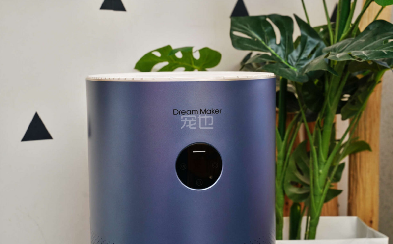 顶部下方是造梦者的Logo和圆形OLED显示屏,显示屏周围是切屏键、开关键、模式切换键,中间的显示窗口可以显示WiFi、童锁、模式(自动、睡眠、一档、二档、三档、最爱)、空气质量、甲醛(HCHO)、颗粒物(PM2.5)、温度、湿度滤芯寿命等信息,用户也可下载《造梦者+》APP,安装并连接成功后,在APP里查看造梦者除醛空气空气净化器的工作状态和空气质量。