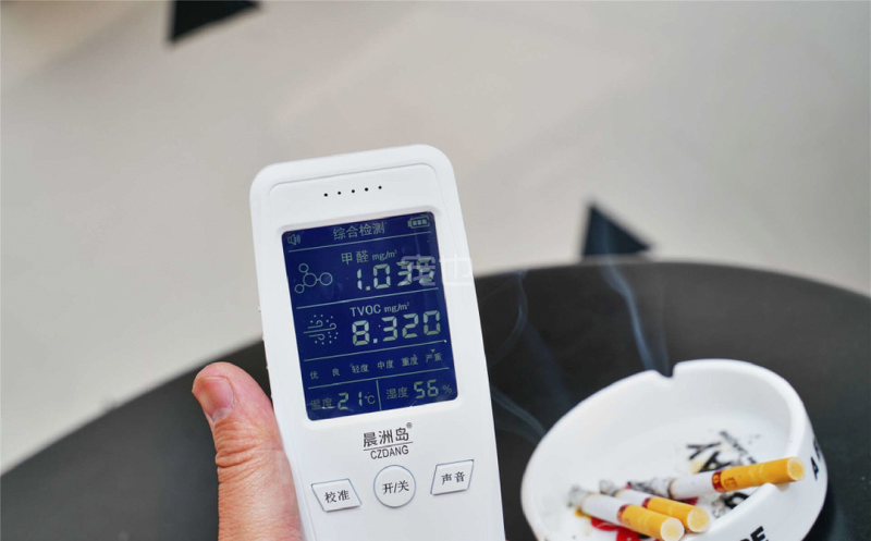 点燃三根烟后,使用专业空气质量仪检测可见甲醛达到了1.035mg/m³,TVOC值8.320mg/m³,日常TVOC的室内宜居标准是0.60mg/m³,甲醛的安全范围是一平方米0.8mg-1mg以下,从对比结果来看,28㎡的卧室内甲醛和TVOC值都属于严重污染,对孩子、老人及有呼吸基本的人群来说,危害非常大。