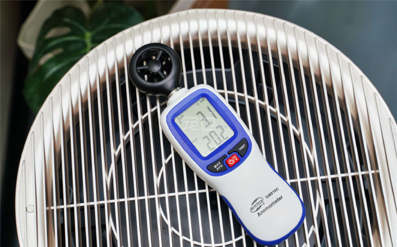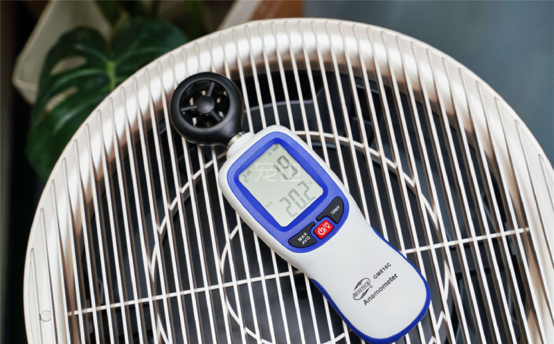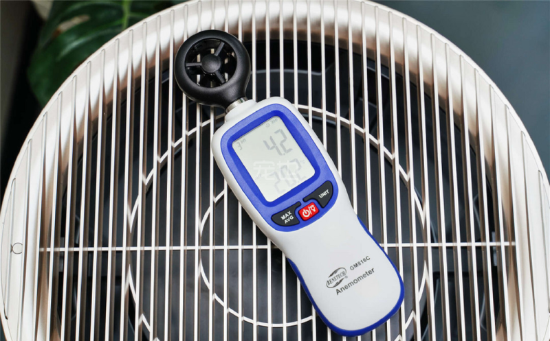 电源线采用了插拔设计,不用的时候可以拔下来方便收纳。通电开机后,先使用专业风量仪进行三档风速测试,从结果可见三档风速为4.2s/m,二档风速为3.1s/m,一档风速为1.9s/m。