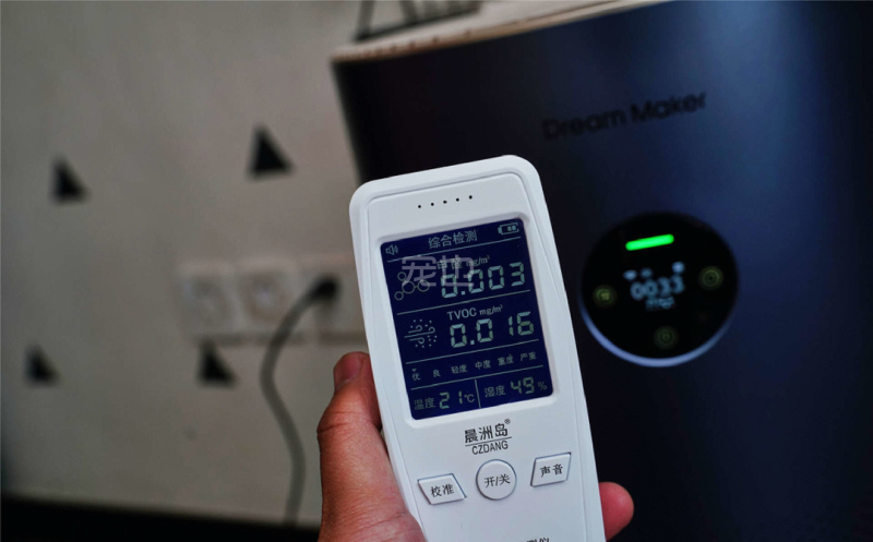 经过20多分钟的净化,空气质量仪检测室内空气甲醛值为0.003 mg/m³,TVOC值为 0.016 mg/m³,造梦者除醛空气空气净化器的空气质量灯呈绿色显示,甲醛值为0.033,空气质量非常好,清新怡人无任何烟味和异味,犹如置身森林。