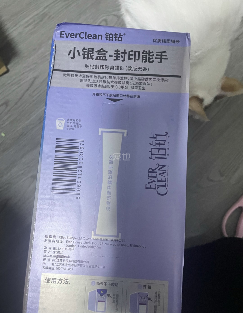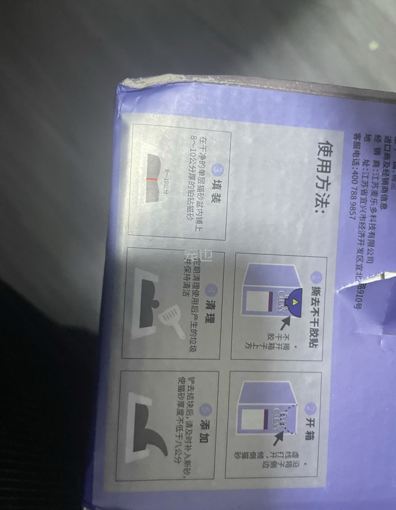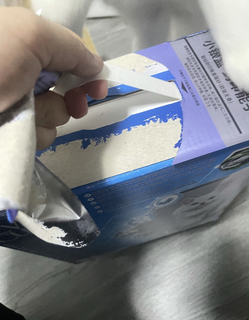 侧面有说明告诉大家怎么去拆开这个纸盒,我还是第一次遇到这种用纸盒装着的猫砂。