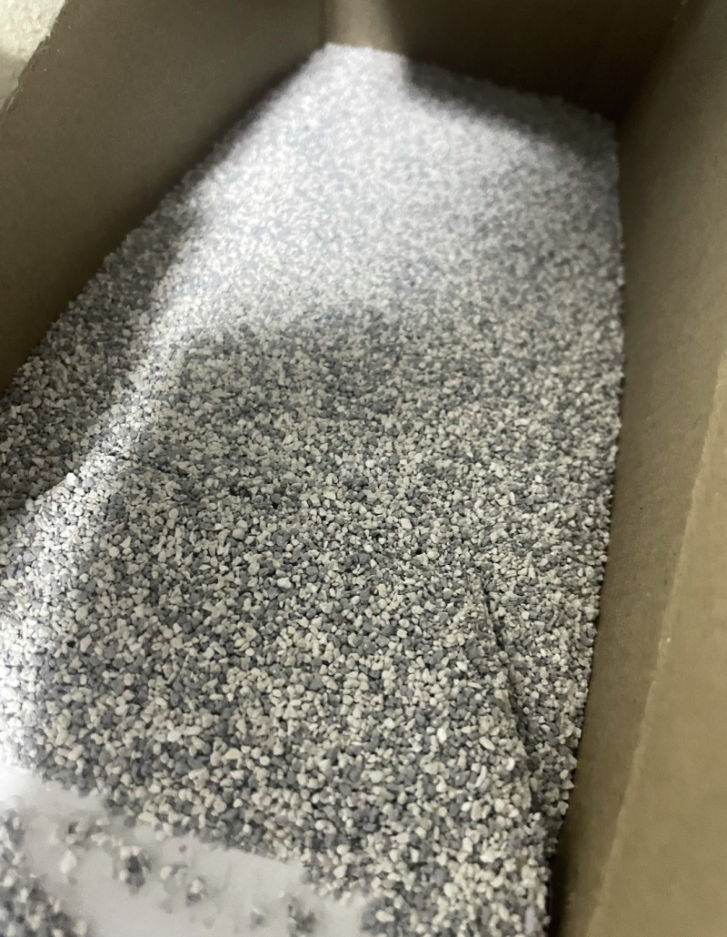如图所示,这款猫砂真的很细,是我目前为止见过最细的矿石猫砂,因为之前也有买过别的矿石猫砂,我倒进猫砂盆的时候是很随意的倒,想要看看灰尘多不多。