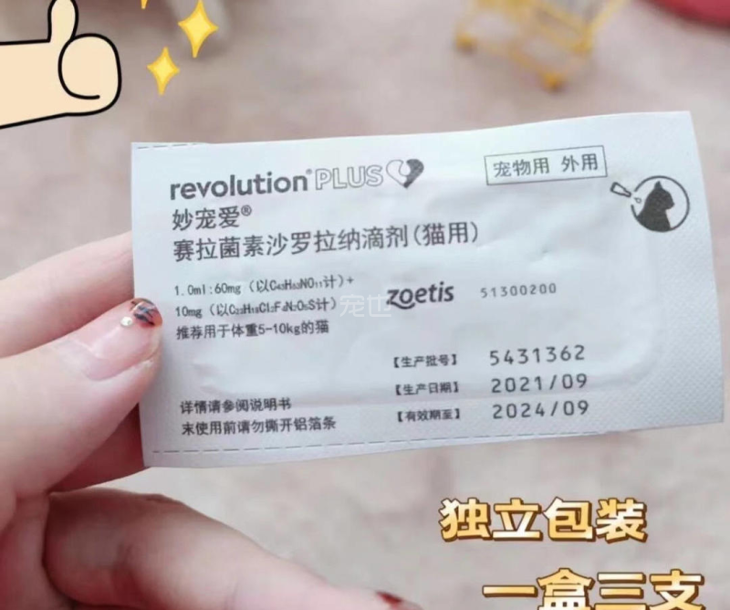 实际上,妙宠爱塞拉菌素沙罗拉纳滴剂提供了多种规格,能满足不同猫的驱虫所需。我下单的这一款适用于体型偏大的成猫,体重在5-10kg之间,3支能用一季度。该滴剂的配方内不含农药,不刺激猫的皮肤,铲屎官们别有顾虑。