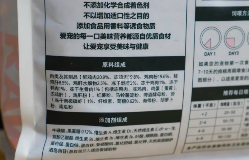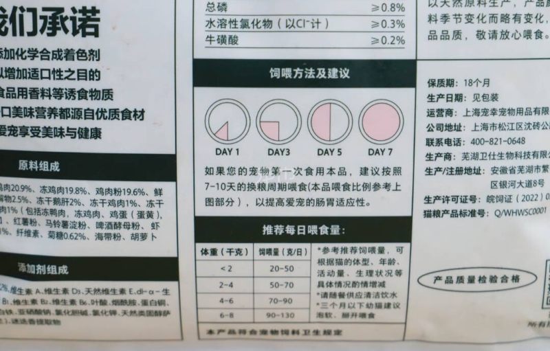 评价猫粮当然还是要聊聊配料表和品控,先说配料表。卫仕山海盛宴配料表前几名都是肉和肉粉,鲜肉占比高达20.9%!粗蛋白含量大于等于39%,整个配料表看下来也没有多余的谷物添加,是很尊重猫咪饮食习惯的优秀“口粮”。