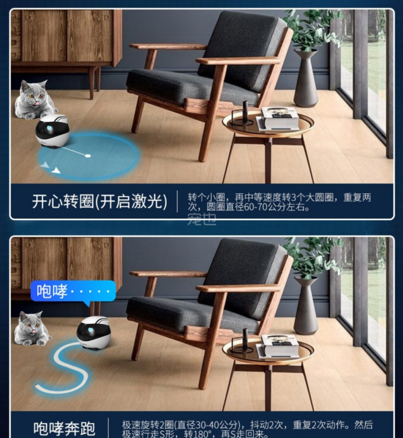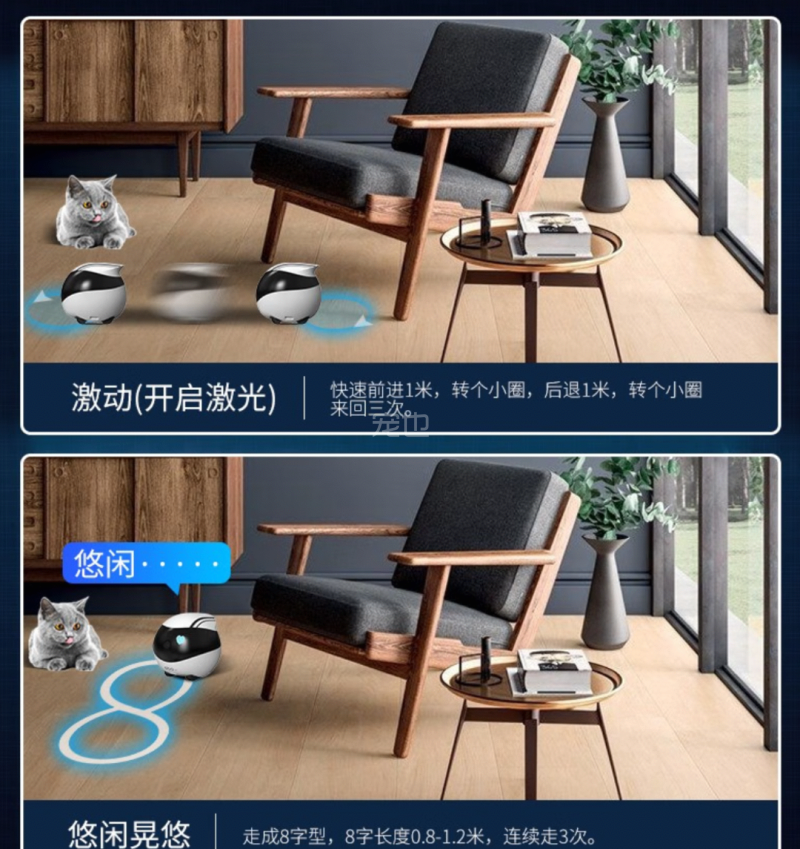 它设计的主要功能还是用来逗宠,或是用来记录一些没人在家时,宠物的可爱瞬间,因此这款机器人专门设计了一些逗宠模式,都是一键开启,降低了操作难度成本。