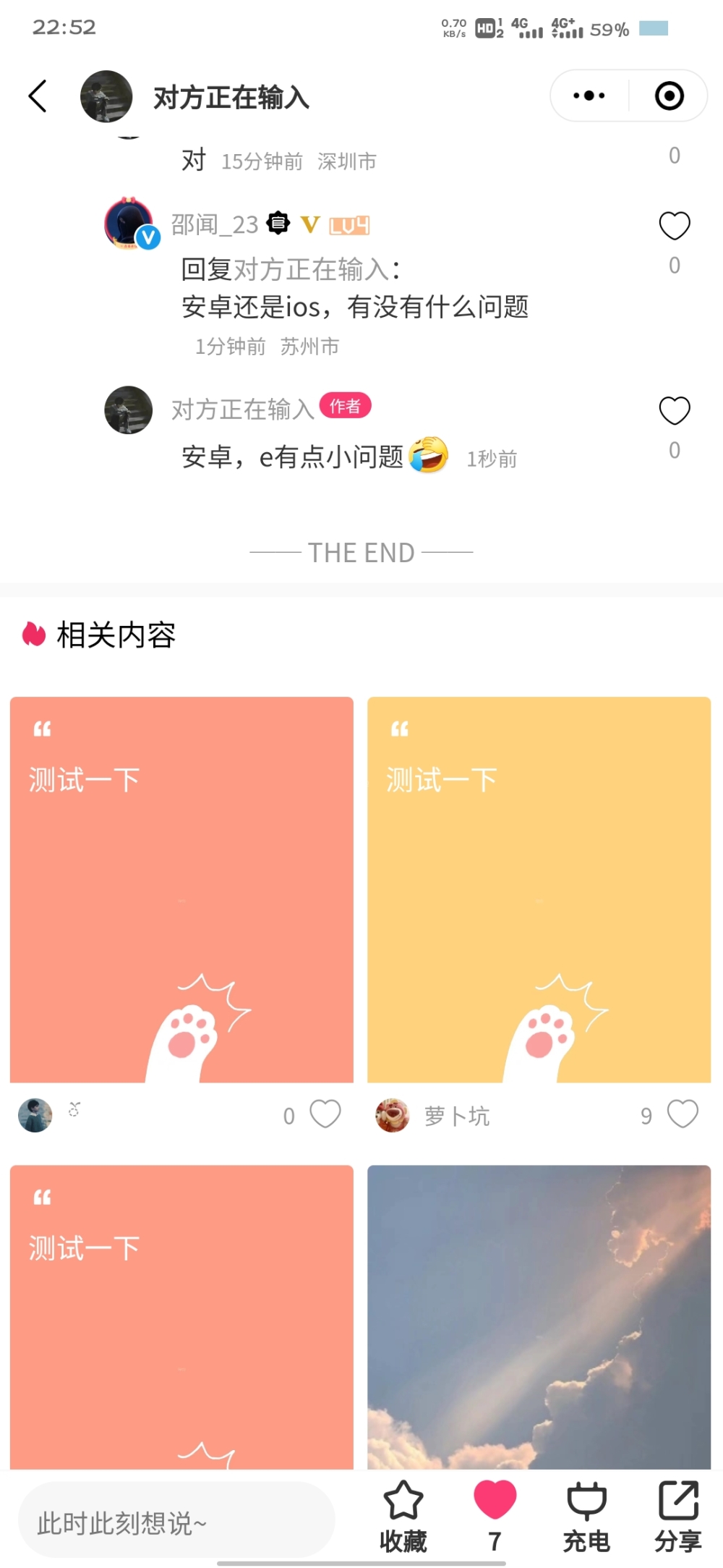 2023-09-10 测试专区 8 评论 228 喜欢 分享 对方正在输入 没有 查看TA的全部内容 +关注 宠也 去发现更多有趣内容 微信扫码打开宠也小程序 体验更多「宠也」新功能 评论 8 邵闻_23 2023-09-10 307 app发的吗 作者 对方正在输入 2023-09-10 0 对 邵闻_23 2023-09-10 1 回复 对方正在输入: 安卓还是ios,有没有什么问题 作者 对方正在输入 2023-09-10 0 安卓,e有点小问题 作者 对方正在输入 2023-09-10 0 比如底下相关内容打不开 邵闻_23 2023-09-10 0 回复 对方正在输入: 什么问题 作者 对方正在输入 2023-09-10 0 点进文章去,相关内容打不开,点击是空白的 邵闻_23 2023-09-11 0 回复 对方正在输入: 现在应该没有了 我也来讲两句